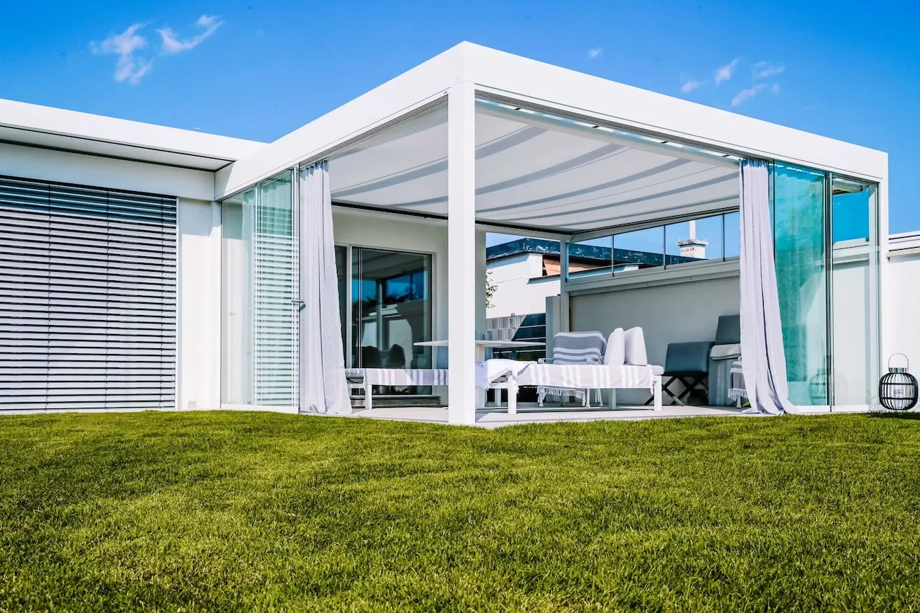 Modern aluminium pergolas are no longer just static structures. Motorised louvred roofs allow you to control light and airflow at the touch of a button, while sensors can adjust to weather conditions automatically.